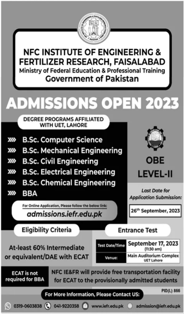 NFC Institute of Engineering and Fertilizer Research, located in Faisalabad, Pakistan, is all set to welcome aspiring students for its Fall 2023 admissions. This prestigious institute, under the Ministry of Federal Education and Professional Training, Government of Pakistan, offers a diverse range of undergraduate programs, including BSc in Computer Science, Mechanical Engineering, Civil Engineering, Chemical Engineering, and BBA,BS.