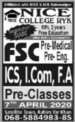Nice College Rahim Yar Khan has announced admissions 2020 in FSc Pre Engineering, FSc Pre Medical, Fa, ICS, ICom. Nice College is affiliated with Bise Bahawalpur. 90 Percent 2 years free education for students.