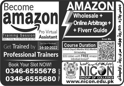 Nicon group of colleges has announces admission for the year 2022. Nicon group of colleges is offering admission for the courses of Amazon Pro Virtual Assistant, Wholesale, Online Arbitrage and Fiver Guide. Those who want get admission in these courses should apply before last date. This institution has a qualified trainer and the highest level of education.