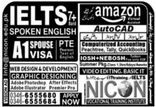 NICON Vocational Training Institute Rawalpindi is offering admissions in the year 2022 for the courses of Autocad, Amazon Virtual Assistant, Computerized Accounting, Video Editing, Basic Information Technology, IELTS Spoken English, Web Design & Development, Graphic Designing. Candidates who want to take admission can call the phone numbers given in the ad below. These courses will help the youth who want to learn and earn by working from home.