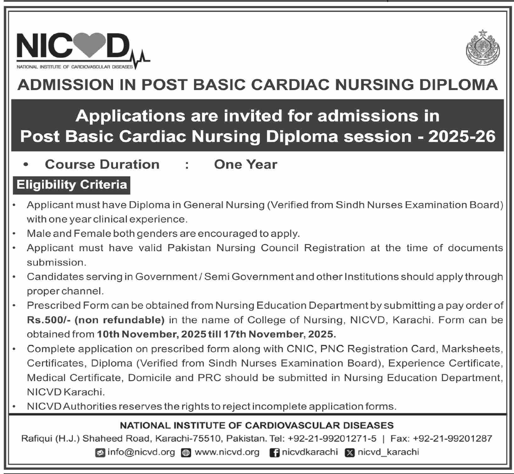 The National Institute of Cardiovascular Diseases NICVD, Karachi invites applications for admission to the Post Basic Cardiac Nursing Diploma for the session 2025–26. This one-year program is designed to enhance the clinical knowledge and skills of registered nurses in cardiac care, preparing them for specialized roles in cardiovascular health settings.