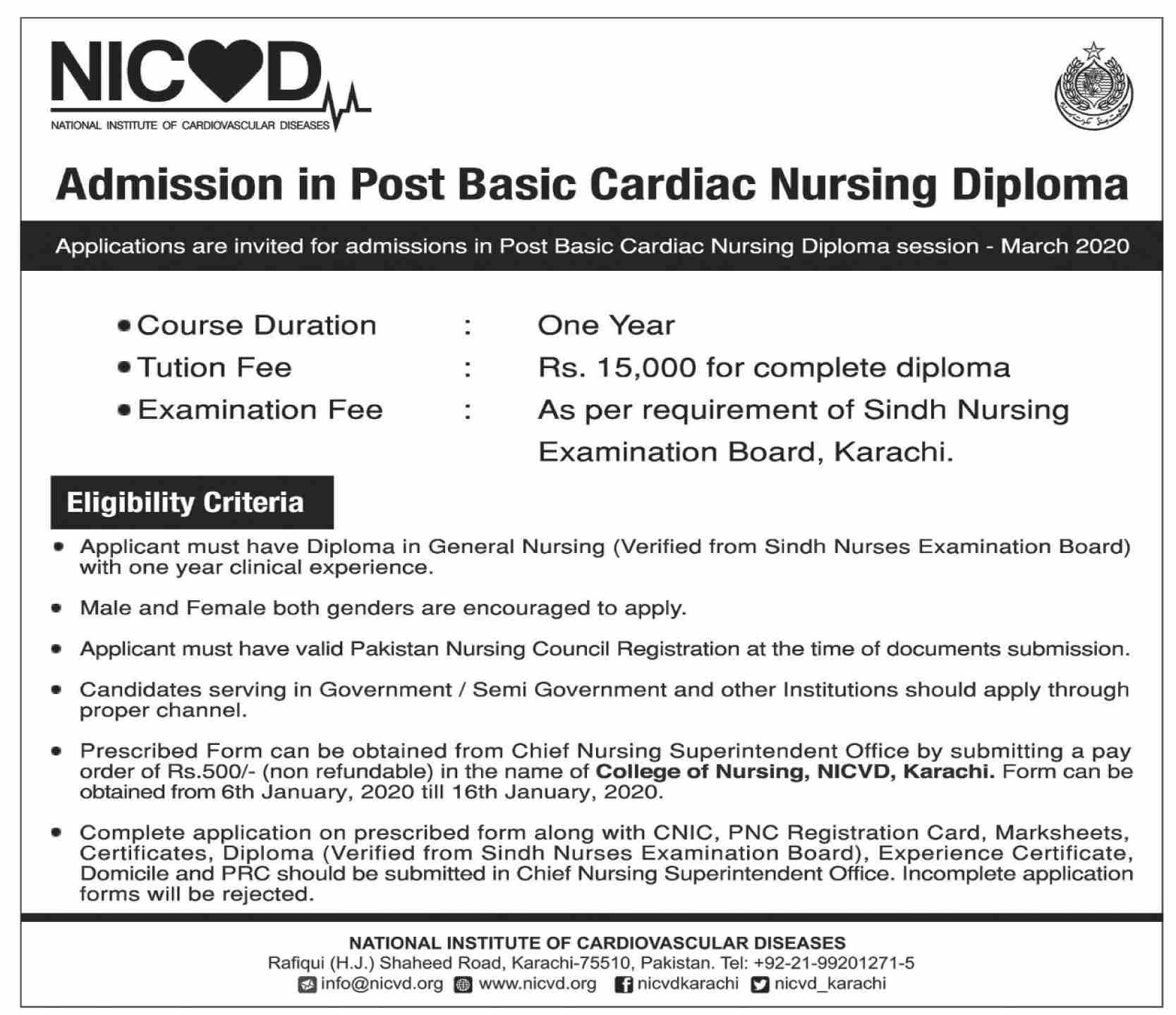 NICVD Nursing Diploma Admission 2020