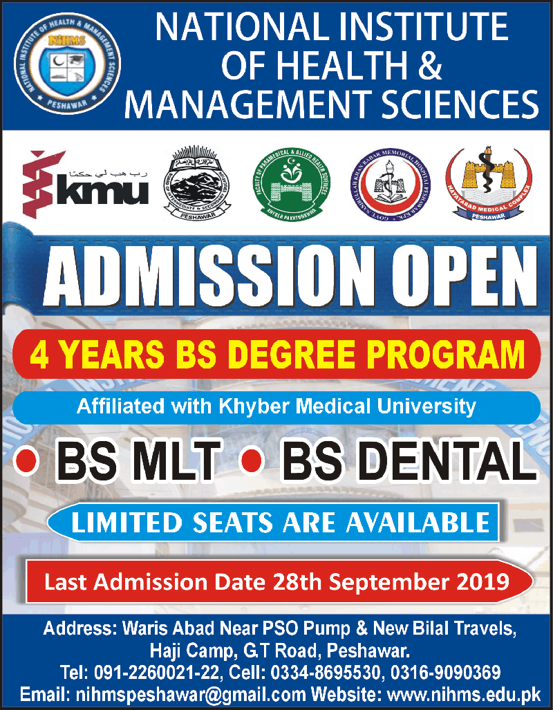 National Institute of Health & Management Sciences Peshawar has announced admissions for BS In Medical Lab Technology, Dental Technology. Limited seats are available. Last date for submission of admission applications 28 Sep 2019.