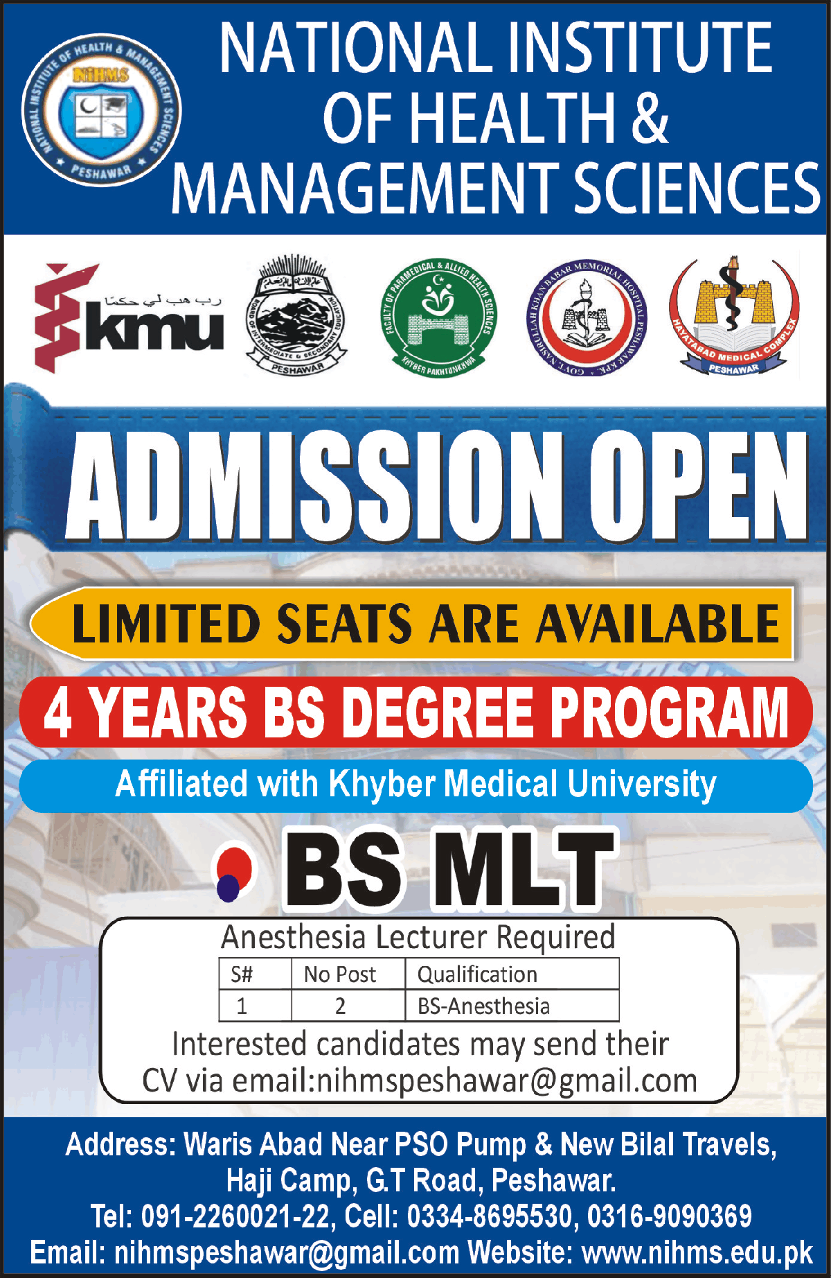 National Institute of Health & Management Sciences Peshawar has offered admissions for BS in Medical Lab Technology. Duration will be 4 years. Limited seats are available. Admissions are open.