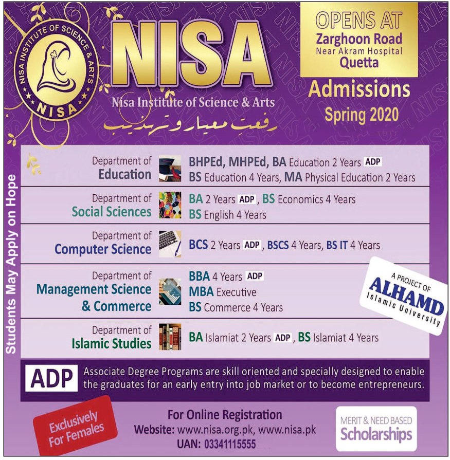 NISA Institute of Sciences & Art Quetta has announced admissions for BS in Commerce, English, Education, Economics, Islamiat, Computer Science, BBA, BA in Islamiat, Education, MA in Physical Education, MBA. Scholarships are available.