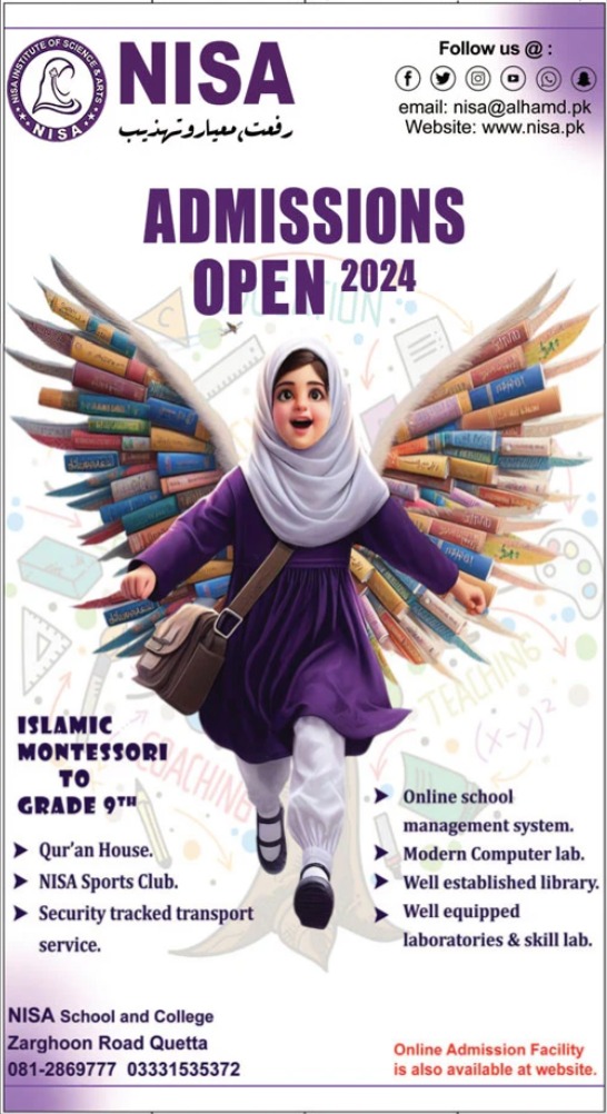 NISA School and College stands as a beacon of educational excellence in Quetta, embodying a commitment to academic rigor, Islamic values, and holistic development. Through its diverse offerings, modern facilities, and nurturing environment, the institution empowers students to thrive academically, morally, and socially. As admissions open for 2024, NISA School and College invites aspiring learners to embark on a journey of knowledge, growth, and enlightenment.