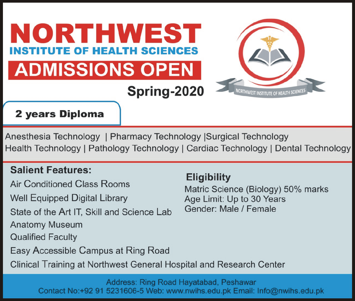 Northwest Institute of Health Science announced the Admission for the session of 2020. The Northwest Institute of Health Science has now starts the Admission in the 2 year diploma in Anesthesia Technology, Pharmacy Technology, Surgical Technology, Health Technology, Pathology Technology, Cardiac Technology, Dental Technology.