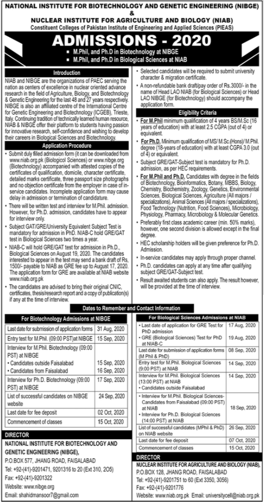 National Institute for Biotechnology and Genetic Engineering NIBGE, Nuclear Institute for Agriculture & Biology NIAB has announced admissions 2020 in M.Phil and Phd in Biotechnology and Biological Sciences in Faisalabad.