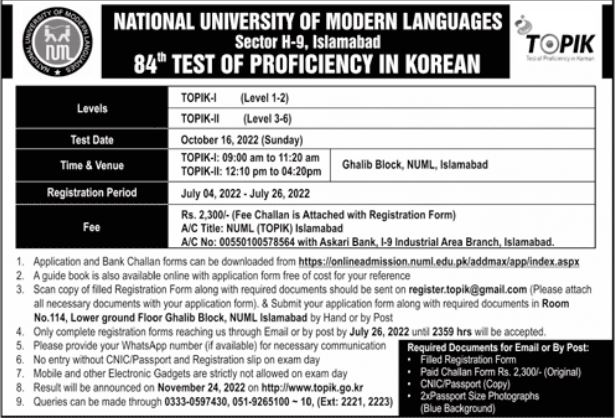 National University of Modern Languages Lahore is updated the information that NUML is going to arrange the NUML 84th Test of Proficiency in Korean and announced NUML 84th Test of Proficiency in Korean Registration Schedule 2022. Candidates who want to appear in Test are directed to get registered themselves. NUML 84th Test of Proficiency in Korean 2022 is going to be held on October 16, 2022 on Sunday. Registration is starting from July 04, 2022 to July 26, 2022. Application and Bank Challan Forms can be downloaded from Numl official website. A guide bool for students is also available with application form. NUML 84th Test of Proficiency in Karen 2022 Result will be announced on November 24, 2022. Restoration is open.