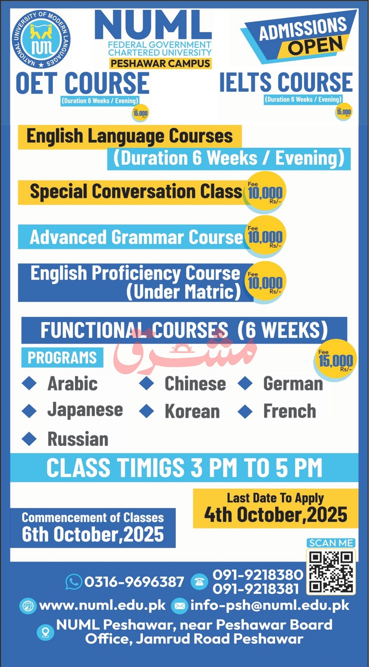 NUML Admissions Offered Various Functional Language Courses 6 Weeks | Evening Classes