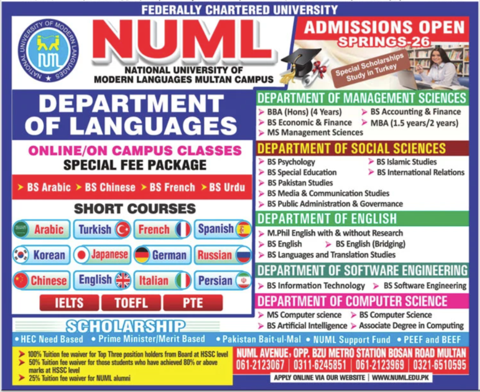 The National University of Modern Languages NUML, Multan Campus, a federally chartered institution, is now accepting applications for Spring 2026 admissions. NUML offers a wide range of undergraduate, graduate, and short courses in modern languages, management, computer sciences, social sciences, and more, combining quality education with flexible learning options.