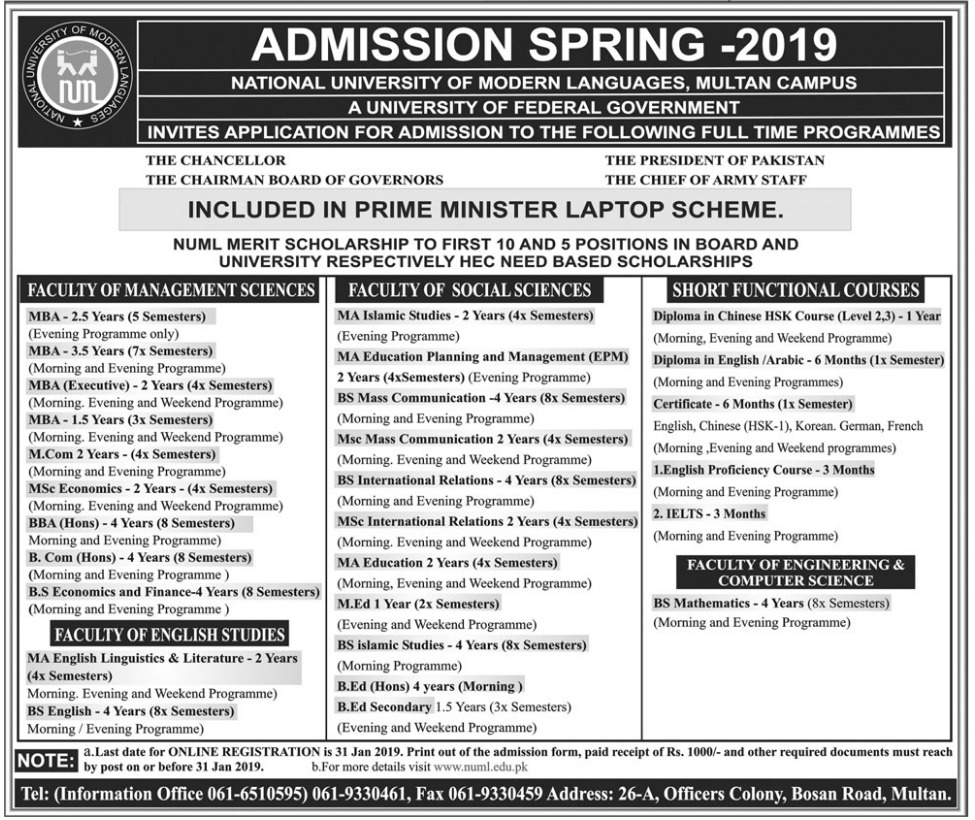 National University of Modern Languages offered admission is different programs of Undergraduate and postgraduate.Students can get admission in MBA MS, MA, BA, B.com, Bs Bsc and many others. last date to applyonline is 31 January 2019.