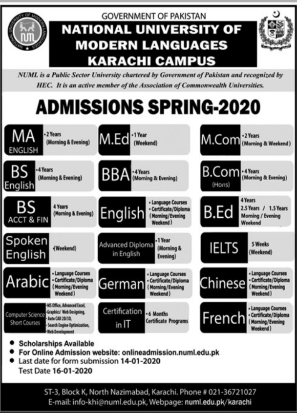 National University of Modern Languages Karachi Campus has announced admissions for BS in English, B.Com, BBA, BEd, MA in English, M.Com, MEd, Languages Courses of IELTS, Chinese Language, Spoken English, Arabic, German, French, Advanced Diploma in English, Computer Sciences Short Courses, Certification in IT. Last date to apply 14 Jan 2020. Test date is 16 Jan 2020.