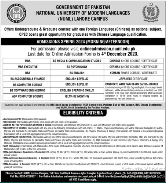 Admissions for Spring 2024: The NUML Lahore Campus is currently accepting admissions for Spring 2024 in both morning and afternoon sessions. Aspiring students can conveniently submit their online admission forms by visiting onlineadmission.numl.edu.pk before the deadline on December 4, 2023.