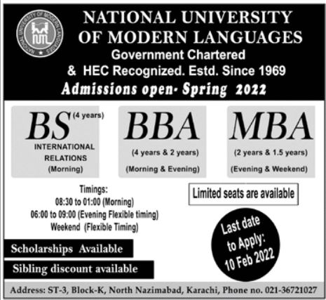 National University of Modern Languages NUML, Government Chartered and HEC Recognized University is invited applications to the candidates who want to take admission in NUML Admissions 2022. NUML Karachi Admissions 2022 are offering for Academic Session Spring 2022. NUML BS Admissions 2022 are announced in International Relations for 4 Years, NUML BBA Admissions 2022 are open for 4 Years and 2 Years, NUML MBA Admissions 2022 for 2 Years and 1.5 Years. The candidates are informed that the admission forms for the National University of Modern Language Admission 2022 should be reached till February 10, 2022. Candidates may apply, Admissions are ongoing.