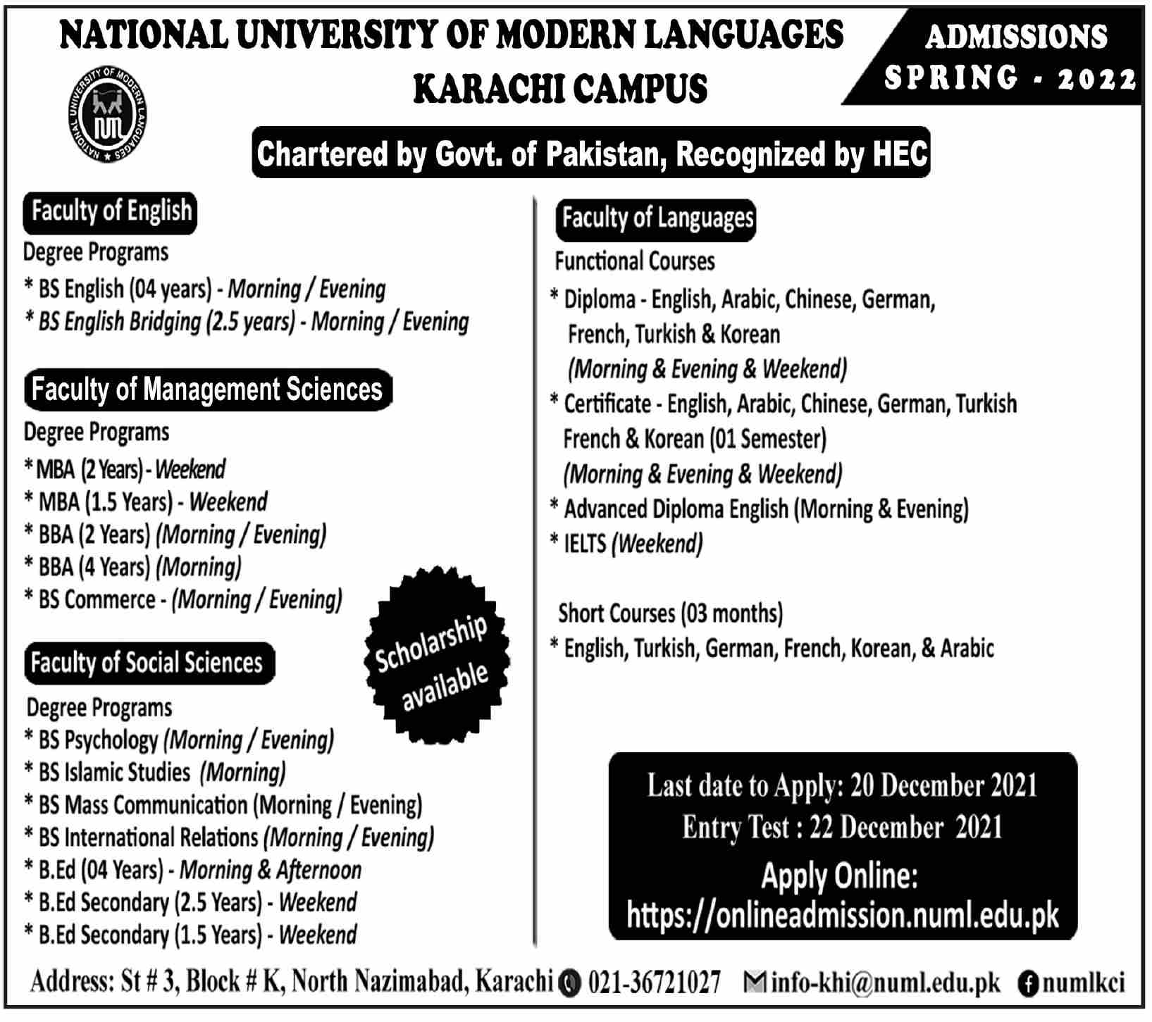 National University of Modern Languages Karachi, Chartered by Govt. of Pakistan, Recognized by HEC is accepting Applications from interested candidates for Admissions to BS in English, English Bridging, Psychology, Islamic Studies, Mass Communication, International Relations, B.Ed MBA, Functional Courses in English, Chinese, German, French, Turkish and Korean. Admissions are open for Session 2022. Admissions forms should be submitted till December 20, 2021. Entry Test will be held on December 22, 2021. Admissions are open ongoing.