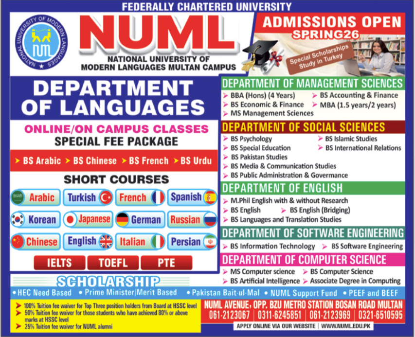 NUML Multan Admissions 2026: Apply Online for Spring Programs