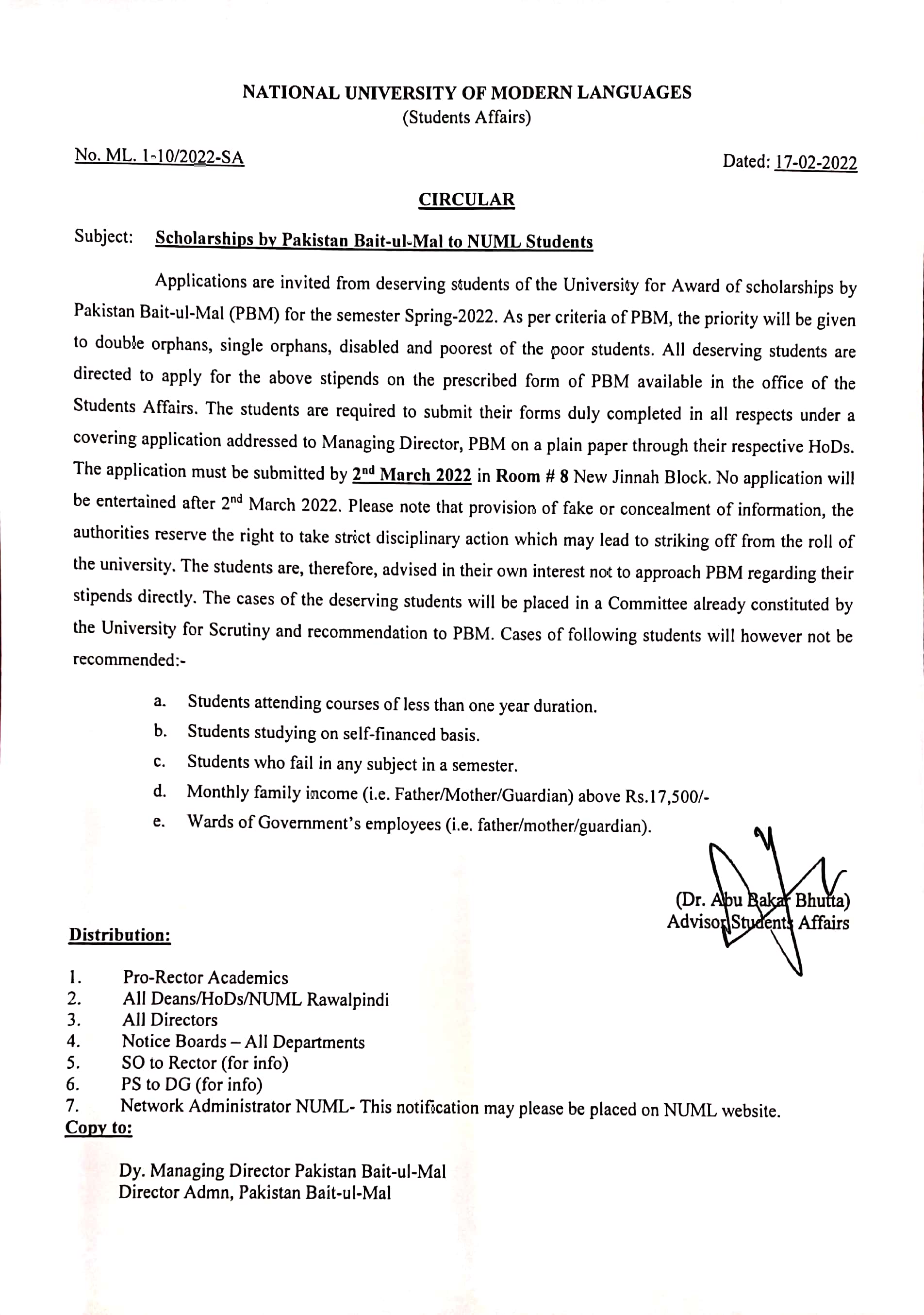 National University of Modern Languages Islamabad is announced NUML Pakistan Bait-ul-Mal Scholarship Spring 2022. For awarding the NUML PBM Scholarship Spring 2022 NUML inviting to deserving students of NUML for the Semester Spring 2022. As per adjusted and planned criteria of PBM, the priority will be given to double orphans, single orphans, disabled and poorest of the poor students. All the deserving students are encouraged to apply for the above stipend on the prescribed form of PBM that is available in the office of the Students Affairs. Students who want to avail NUML Pakistan Bait-ul-Mal Scholarship 2022 are directed to submit their complete application forms under a covering application addressed to Managing Director, PBM. Applications should be reached till March 02, 2022. Application after deadline will not be accepted. The candidates must read instructions carefully before submitting an application.