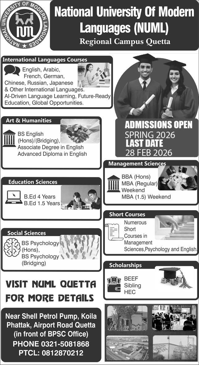 NUML Quetta Courses Admissions Open for 2026 Your Pathway to Success