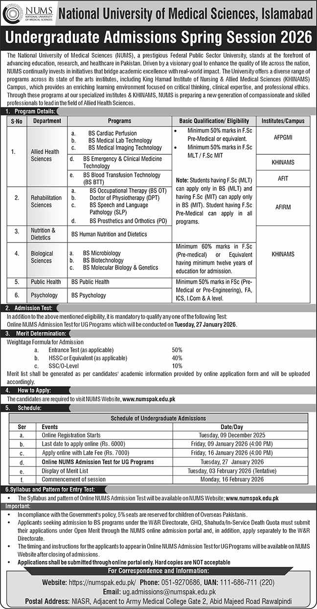 The National University of Medical Sciences NUMS Islamabad, a premier federal public sector university, invites applications for undergraduate programs for the Spring 2026 session. NUMS is dedicated to advancing education, research, and healthcare in Pakistan, providing students with opportunities to combine academic excellence with practical experience.