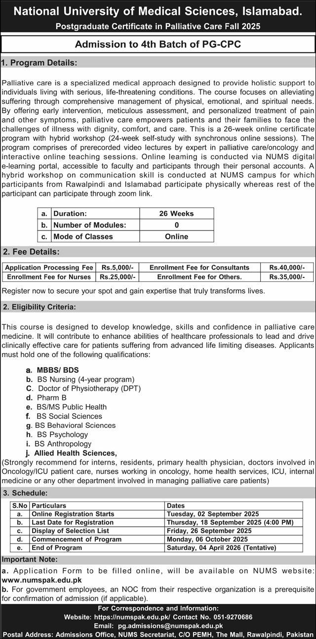 The National University of Medical Sciences NUMS is now accepting applications for the 4th Batch of its Postgraduate Certificate in Palliative Care PG-CPC for Fall 2025.