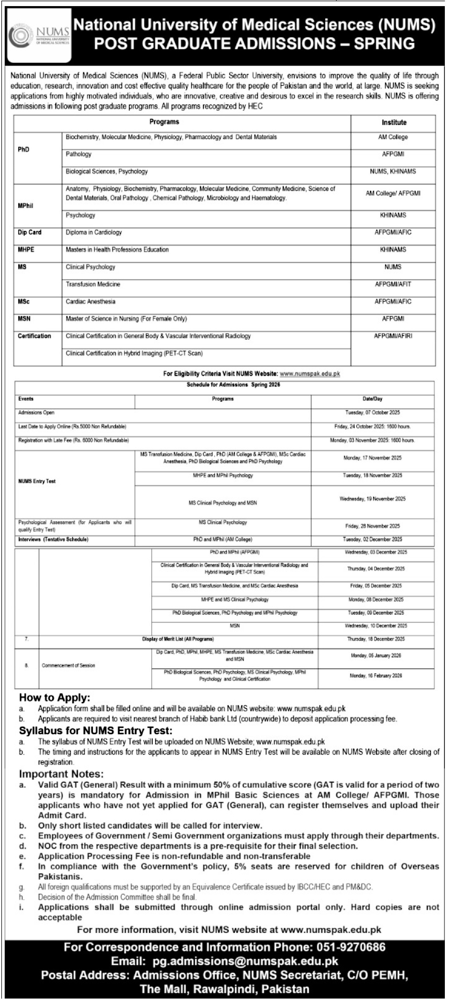 The National University of Medical Sciences NUMS — a premier federal public sector university — is now accepting applications for Spring 2026 postgraduate admissions. With a vision to improve the quality of life through world-class education, research, innovation, and affordable healthcare, NUMS invites motivated, innovative, and research-oriented candidates to apply for a wide range of postgraduate programs.