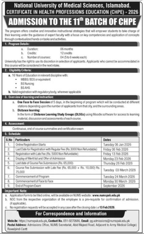 The National University of Medical Sciences NUMS, Islamabad invites applications for admission to the 11th Batch of the Certificate in Health Professions Education CHPE – 2026. This program is designed to enhance the educational competencies of health professionals through innovative teaching strategies and learner-centered approaches under the guidance of experienced faculty.