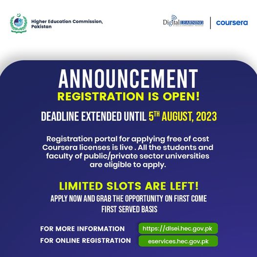 In a bid to promote accessible and quality education, the National University of Medical Sciences NUMS and the Higher Education Commission HEC have jointly announced an extension of the deadline for a remarkable opportunity – a free Coursera License. This initiative aims to empower learners with a diverse range of online courses, fostering skill development and knowledge enhancement.