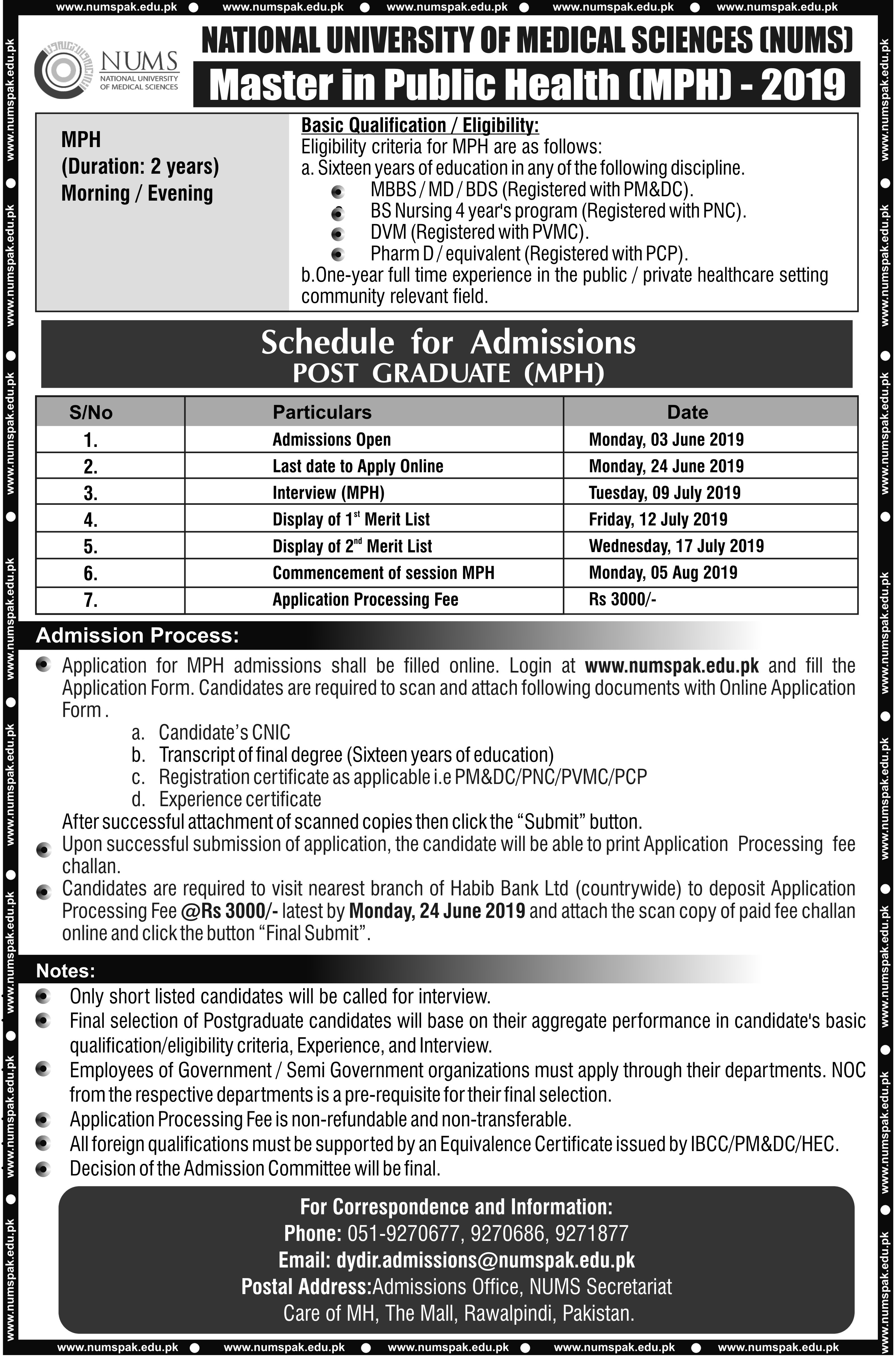 Islamabad, National University of Medical Sciences Islamabad is going to start admission process in Master in Public Health and the students can submit their admission forms for the postgraduate classes by the closing date of 24 June 2019. According to NUMS MPH Admission 2019, the candidates will appear for their NUMS MPH interviews 2019 on 09-07-2019. The candidates will watch first merit list, which will be displayed on 12-07-2019 and the second merit list will be displayed on 17-07-2019. The candidates will note NUMS MPH session commencement 2019 from 05-08-2019.