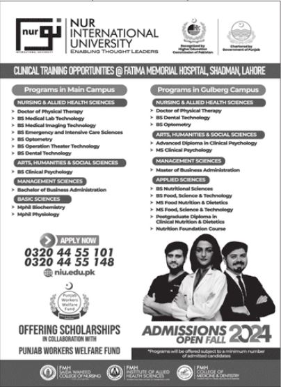 NUR International University NIU is proud to announce Admissions 2024. Located in the heart of Lahore, NIU is committed to Enabling Thought Leaders through its comprehensive and innovative programs. NIU provides students with extensive clinical training opportunities at Fatima Memorial Hospital, Shadman, Lahore. This hands-on experience is crucial for those pursuing careers in health sciences.