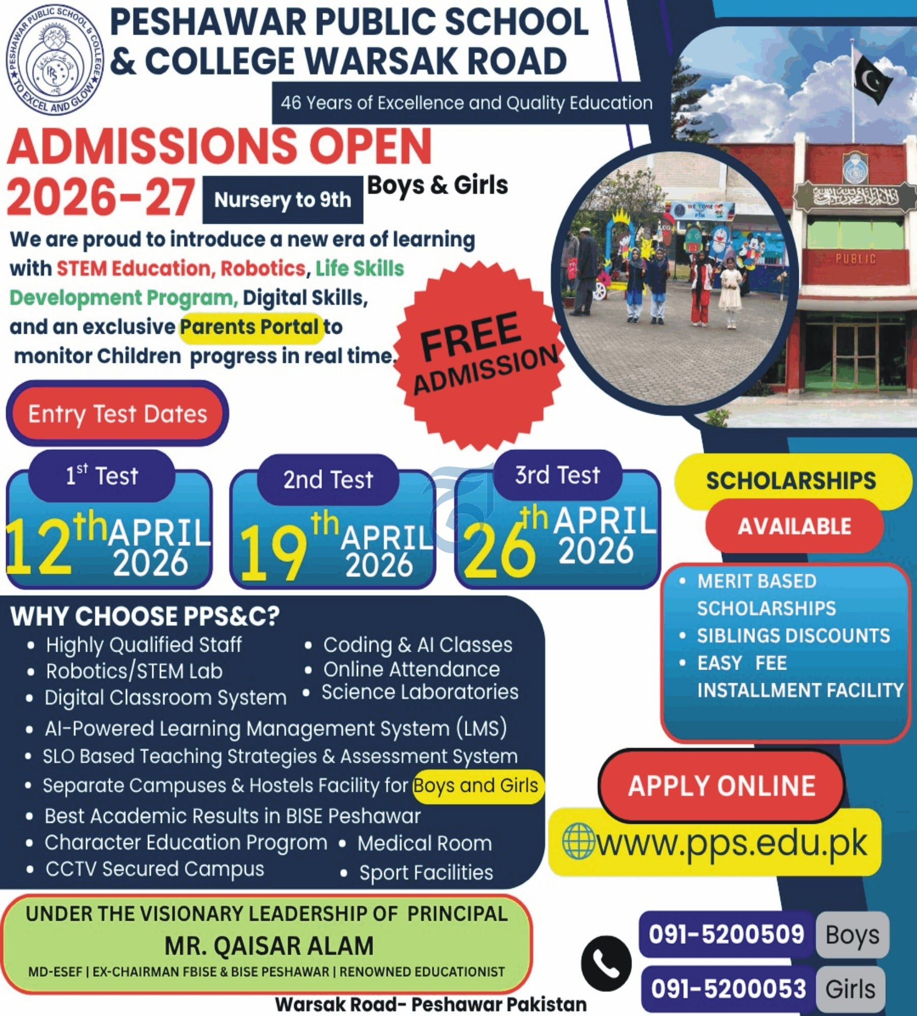Peshawar Public School & College, located on Warsak Road, proudly announces admissions 2026 for the academic session 2026–27. With a strong legacy of 46 years, PPS&C continues to deliver outstanding academic performance while embracing modern education systems to prepare students for the future.A New Era of Learning