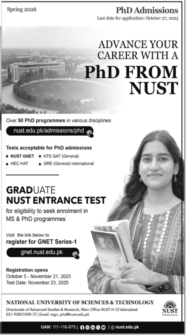 The National University of Sciences & Technology NUST, a leading institution in higher education and research, is now accepting applications for PhD Admissions – Spring 2026. With over 50 PhD programmes across diverse disciplines, NUST offers scholars the opportunity to contribute to world-class research and define the future through innovation and academic excellence.
