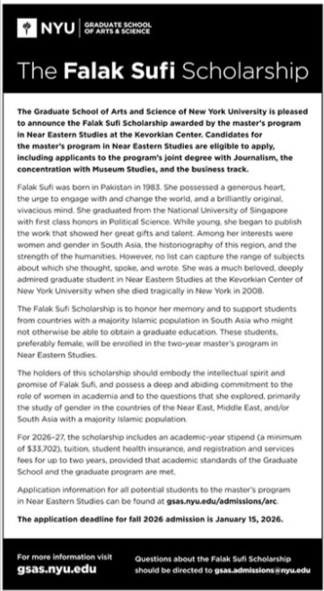 The Graduate School of Arts and Science at New York University NYU proudly offers a unique opportunity for prospective students through the Falak Sufi Scholarship, awarded within the master’s program in Near Eastern Studies at the Kevorkian Center. This prestigious scholarship not only honors the memory of Falak Sufi, a brilliant and compassionate scholar, but also supports students from South Asian countries with majority Islamic populations who aspire to pursue graduate education.