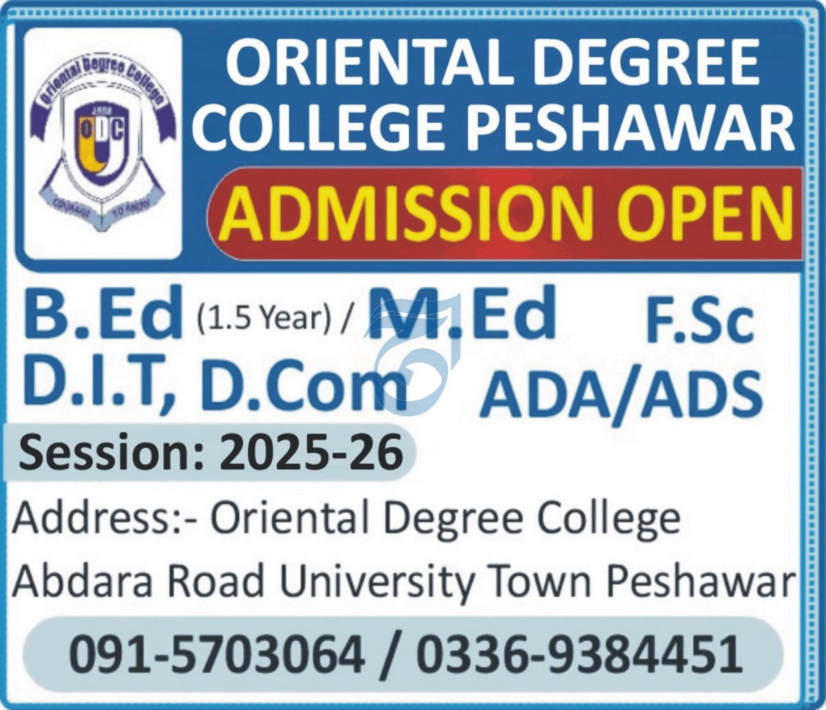 Oriental Degree College, Peshawar is pleased to announce that admissions are now open for the academic session 2025–26. As one of the region’s recognized and growing institutions, ODC offers a range of academic and professional programs designed to prepare students for successful futures in education, science, technology, and commerce.