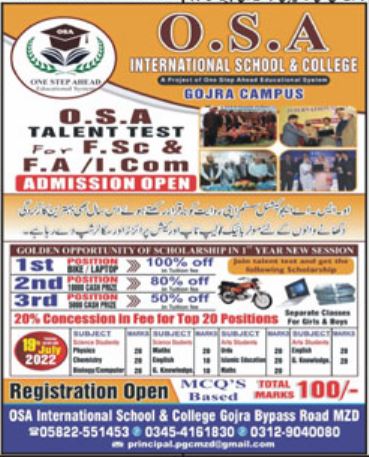 OSA International School & College Gojra is updated the information to the innovative candidates that OSA International School & College is going to organize the OSA International School & College Talent Test for OSA International School & College Admissions 2022. OSA International School & College FA Admissions 2022, OSA International School & College FSc Admissions 2022 and OSA International School & College I.Com Admissions 2022 are granting on the basis of Talent Test. Last date for registration is July 18, 2022. Registration is open now.