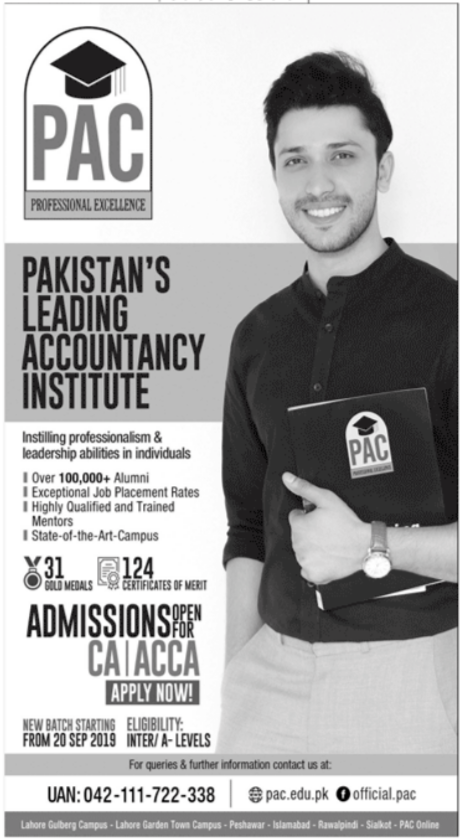 PAC Lahore has announced admissions for CA ACCA. Intermediate passed candidates are eligible to apply. Admissions are open.