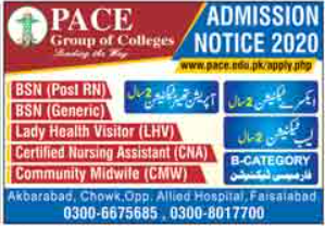 PACE Group of Colleges Faisalabad invites applications for admissions 2020 for BSN Nursing Post RN, BSN Generic, Lady Health Visitor LHV, Certified Nursing Assistant CNA, Community Midwifery CMW, Xray Technician, Lab Technician, Operation Theater Technician, Pharmacy Technician in Faisalabad.