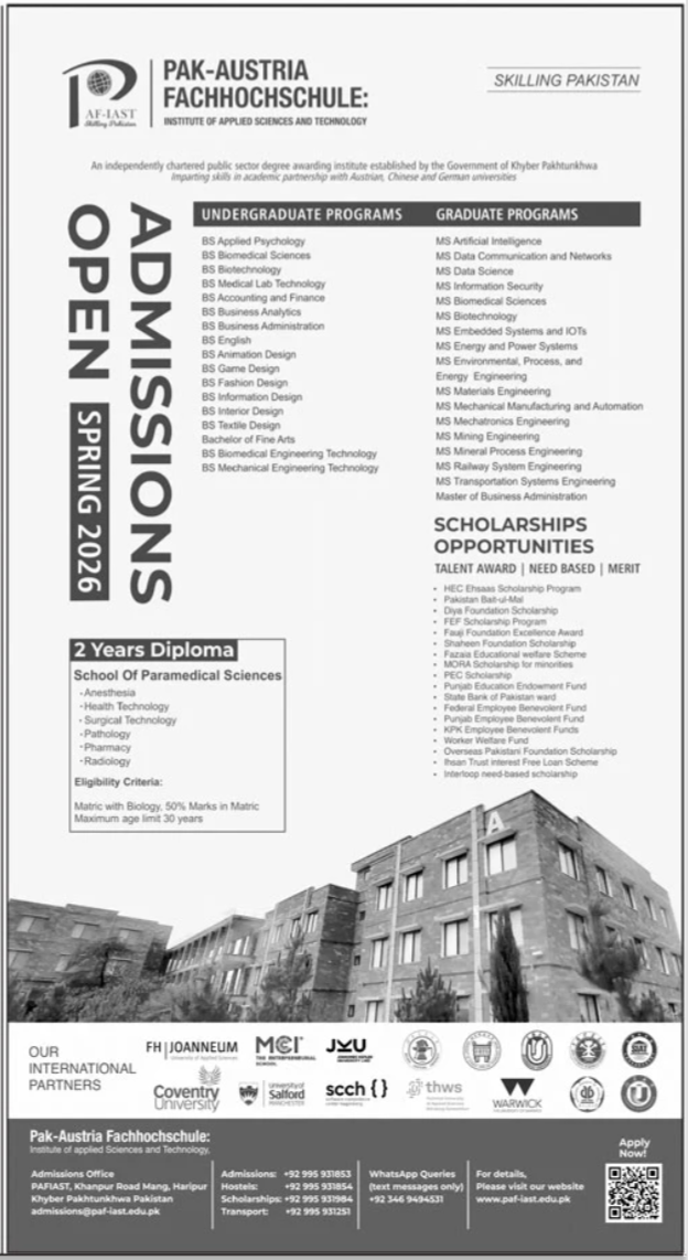 PAF-IAST invites motivated students to apply for Spring 2026 admissions and become part of a leading institute committed to academic excellence, technical skills development, and global opportunities. With world-class programs, international partnerships, and extensive scholarship opportunities, PAF-IAST is the gateway to a successful professional and academic career.