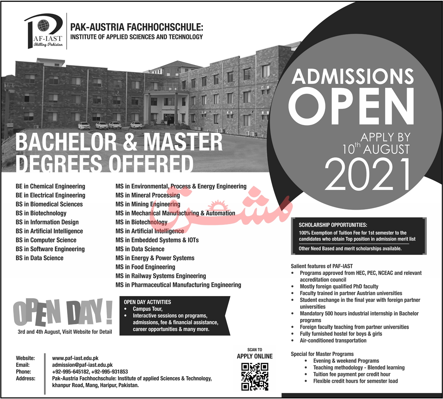 Pak Austria Fachhochschule Institute of Applied Sciences and Technology PAF-IAST is accepting applications for Admissions of BE in Chemical Engineering, Electrical Engineering, Biomedical Engineering, Biotechnology, Information Intelligence, Computer Science, Software Engineering, Data Science, MS in Environmental, Process and Energy Engineering, Mineral Processing, Mining Engineering, Mechanical Manufacturing and Automation, Biotechnology, Artificial Intelligence, Data Science, Railway Systems Engineering, Pharmaceutical Manufacturing Engineering, Embedded Systems and IOTs. Admissions are open for Academic Session 2021. Scholarships are also available for deserving students. Candidates shall send their Applications for Admissions as per rule by August 10, 2021.