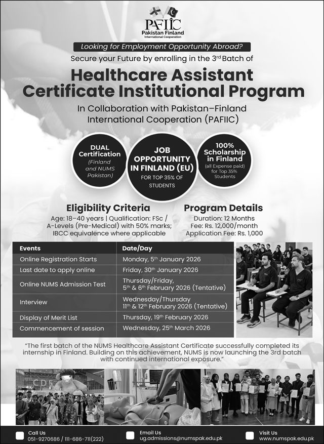 The Pakistan-Finland International Cooperation PAFIIC in collaboration with NUMS, Pakistan is now accepting applications for the 3rd Batch of the Healthcare Assistant Certificate Institutional Program.
