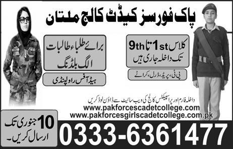 Pak Forces Cadet College Multan has announced admissions for Class 1st-9th. Admissions are open. Separate Building for Boys & Girls.