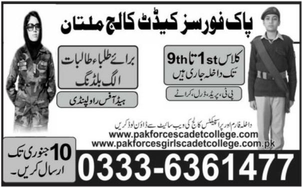 Pak Forces Cadet College Multan 1st to 9th Admission 2020