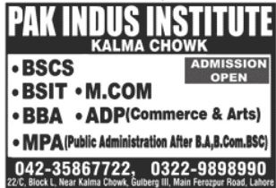 Pak Indus Institute invites applications for admissions in BS Computer Science, BS Information Technology, BBA, ADP Commerce and Arts, MPA Public Administration in Lahore.
