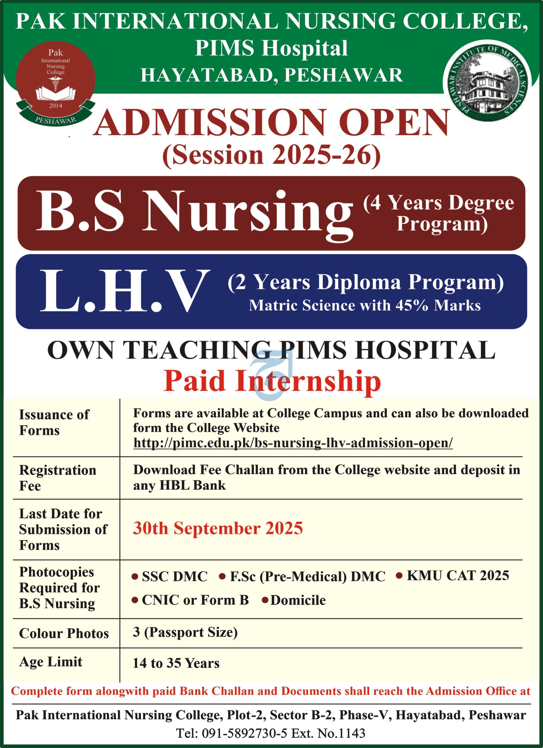 Pak International Nursing College, located within the premises of PIMS Hospital, Hayatabad, Peshawar, is pleased to announce that admissions 2025 are now open for the Session 2025-26 in the following programs: