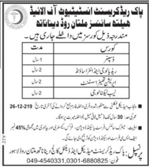 Pak Red Crescent Institute of Allied Health Sciences Lahore has offered admissions for Courses in Dispenser, Radiology & Ultrasound, Operation Theater Assistant, Lab Technology. Last date for submission of admission applications is 26 Dec 2019.