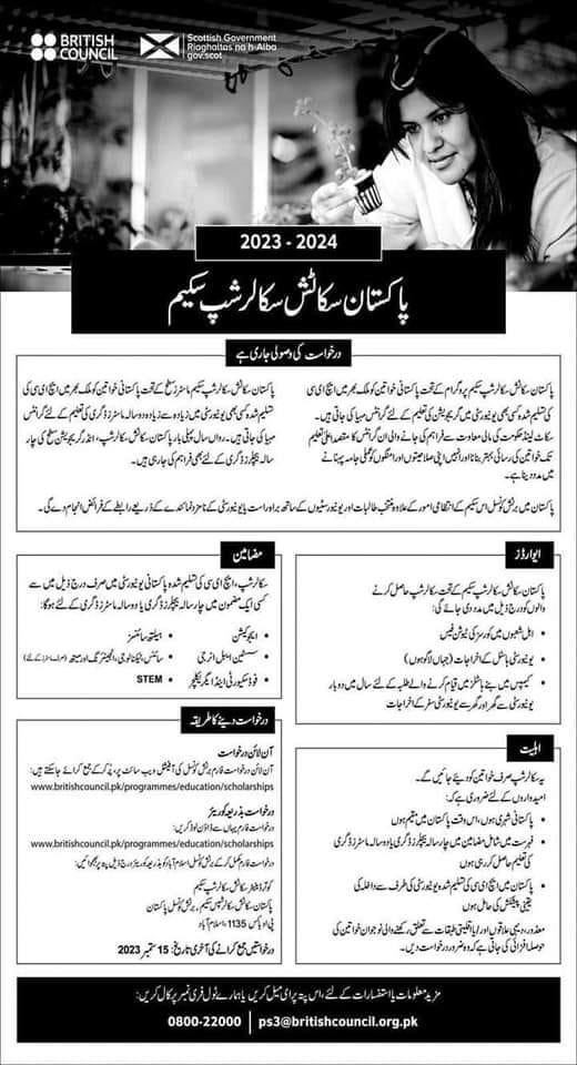 The female candidates can get the detailed information regarding Pak Scottish Female Scholarship Scheme 2023-24. This scholarship will be offered to the students in four year graduate program or two year master degree programs in the subjects of Education, Health Sciences, Sustainable Energy, Science, Technology, Engineering, Maths and Food Security and Agriculture and STEM. This scholarship will cover tuition fee, hostel charges, traveling expenses from university to home and from home to university two times in a year. The candidates can submit their application forms by the closing date of 15-09-2023.