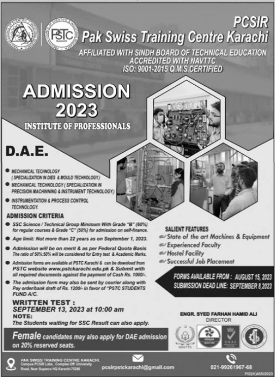 Welcome to Pak Swiss Training Centre Karachi Admissions 2023! Prepare to embark on a journey of technical excellence and skill development in the fields of Mechanical Technology and Instrumentation & Process Control Technology. Our specialized D.A.E. programs offer hands-on learning and practical experience, ensuring youre well-prepared for the industry.