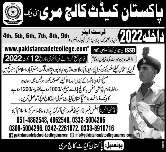 Pakistan Cadet College Murree is has been offered the Pakistan Cadet College Admissions 2022 and looking for applications from Aspirants for granting the Pakistan Cadet College Murree Admissions 2022 in Class 4th, 5th, 6th, 7th, 8th, 9th. Pakistan Cadet College Murree Intermediate Admissions 2022 are also open in Pre-Engineering, Pre-Medical, Computer Science. Applications must be submitted by the closing date of June 12, 2022. Pakistan Cadet College Murree Written Test 2022 will be held in Quetta, Karachi, Hyderabad, Bahawalpur, Peshawar, Gilgit, Muzaffarabad, Islamabad. Pakistan Cadet College Murree Admissions 2022 are open now.