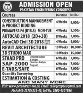 Pakistan Engineering Congress is offering admissions 2020 in Construction Management and Project Bidding, Primavera, Autocad, Revit Architecture, 3D Studio Max, STAAD PRO, SAP-2000 in Lahore.