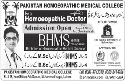 Pakistan Homeopathic Medical College has offer the new admissions for BHMS(5 years) and DHMS(4 years) in Lahore. Students can get more information from college administration department.